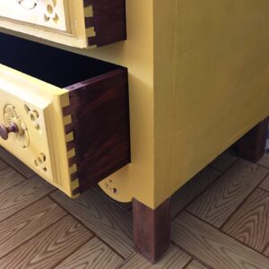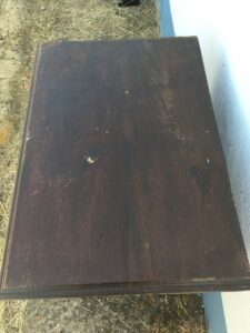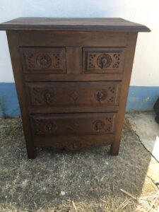 Esta pequena cómoda, em madeira maciça (possivelmente mogno africano) veio de Angola e estava na antiga casa dos avós, guardada há muitas décadas, porque era escura e não tinha lugar nas novas casas da família.