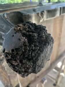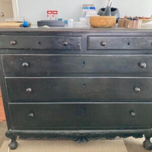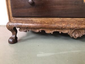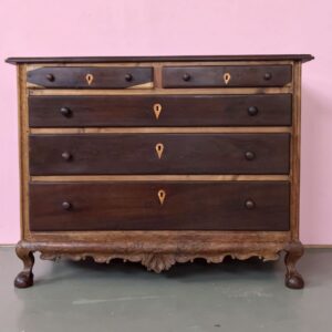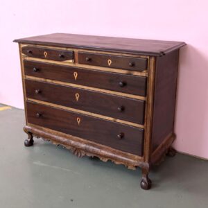 Cómoda em madeira de pau-santo e castanho, com muitas marcas do passado e estragos profundos causados pelo insecto xilófago.