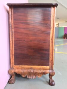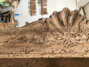 Consolidámos e refizémos as partes danificadas e retirámos camadas de tinta e verniz escuro que escondiam a beleza da madeira.