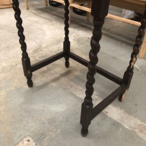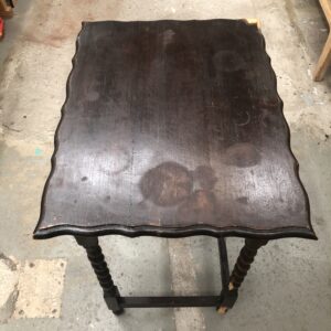 Um verniz muito escuro, uma travessa em falta e encaixes soltos ensombravam a elegância simples desta mesa de apoio, em madeira de castanho.