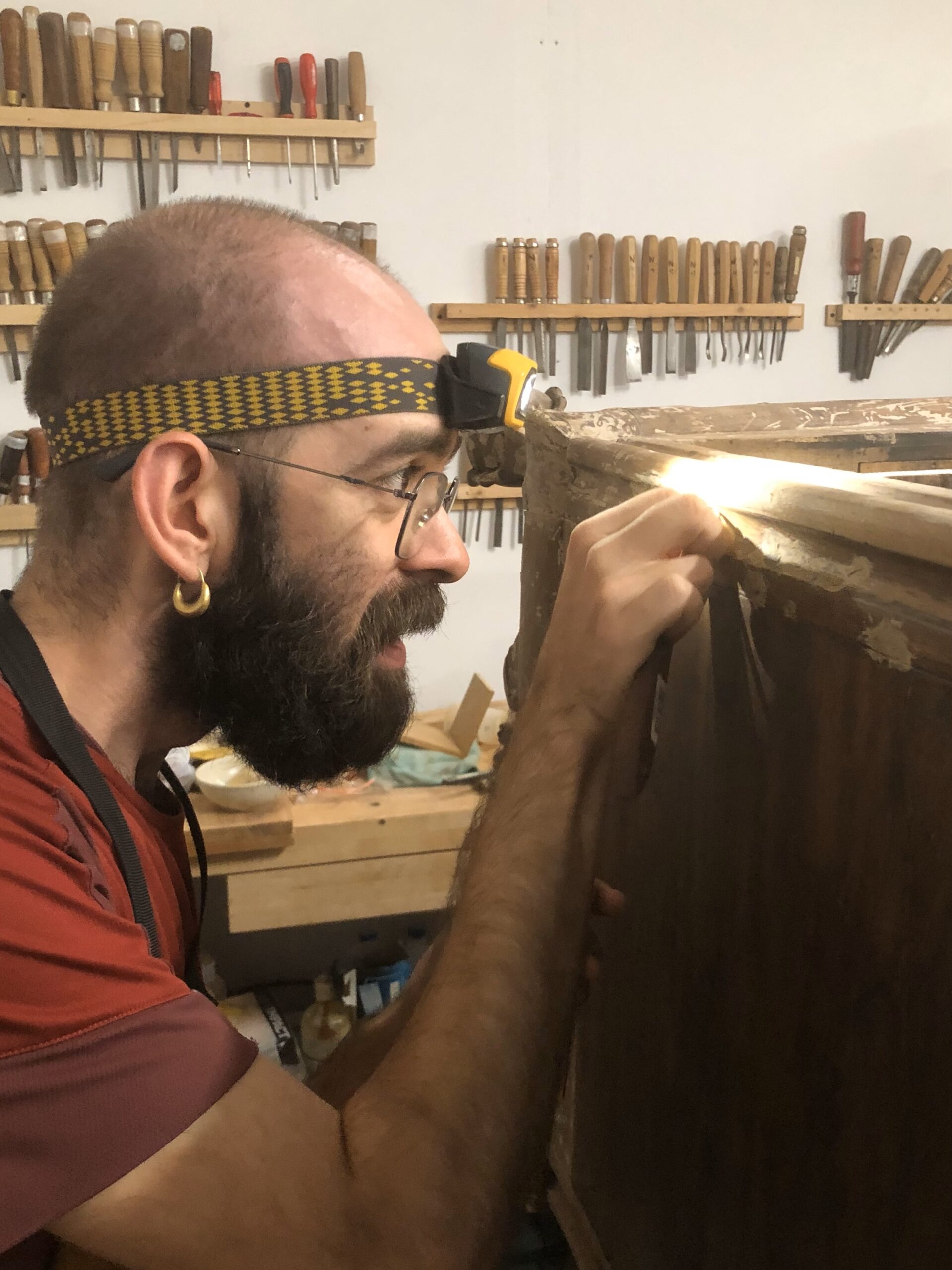 Constítuida por profissionais formados nas áreas do restauro e da marcenaria (com especialização em embutidos e talha), a oficina está em pleno funcionamento desde Janeiro de 2023. Sempre que necessário, trabalhamos com profissionais de áreas que complementam o nosso trabalho, como empalhamento, torno, douramento ou pintura decorativa. Trabalhamos também com outros marceneiros e restauradores, o que nos permite tanto intervenções em pequena escala como projectos de maior dimensão e complexidade. Fazem parte do nosso portfólio, o restauro de mobiliário de edifícios de interesse histórico, como a Sinagoga de Lisboa ou a Farmácia Barreto.